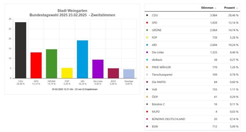 Am 23. Februar 2025 fand die vorgezogene Bundestagswahl statt. Detaillierte Informationen erhalten Sie in unserem Votemanager unter Bundestagswahl 2025 23.02.2025 - Stadt Weingarten