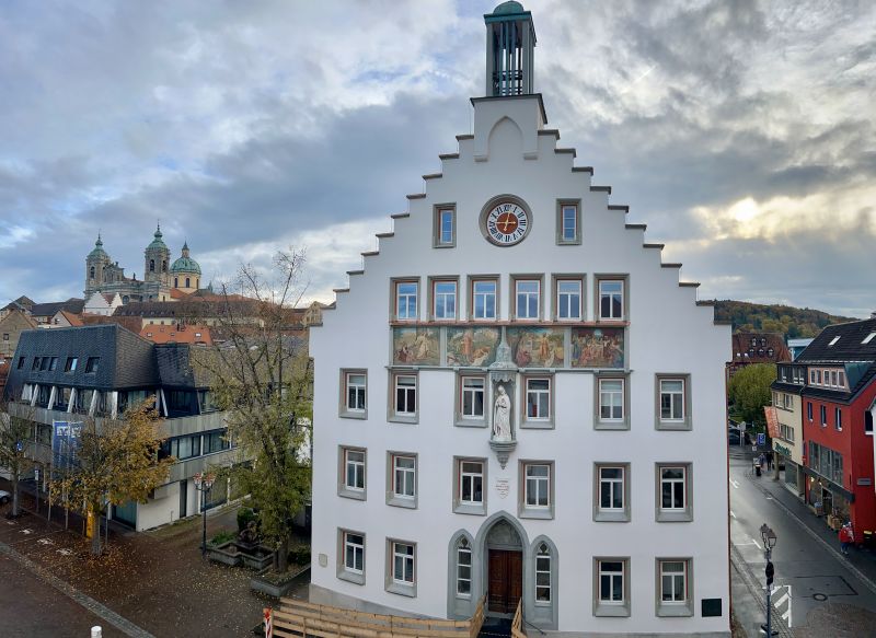 Der aufsehenerregende Abbau des Gerüsts Mitte Oktober 2025 markiert den Abschluss des dritten und letzten großen Bauabschnitts der Sanierung des Weingartener Amtshauses. Gut ein Jahr war das fünfgeschossige Gebäude rundum verhüllt. Umso mehr fällt das neue Gesicht ins Auge: Die Fassade ist strahlend weiß, Naturstein, Putz und Farbe wurden restauriert, der Blick auf die Welfensage über dem Haupteingang ist wieder frei. Zimmerer und Blechner haben das Dach grundlegend erneuert und auch die neue Photovoltaik-Anlage ist einsatzbereit. Seit kurzem können auch wieder zwei der drei öffentlichen Parkplätze in der Wilhelmstraße, die aufgrund der Sanierungsmaßnahmen gesperrt waren, genutzt werden.