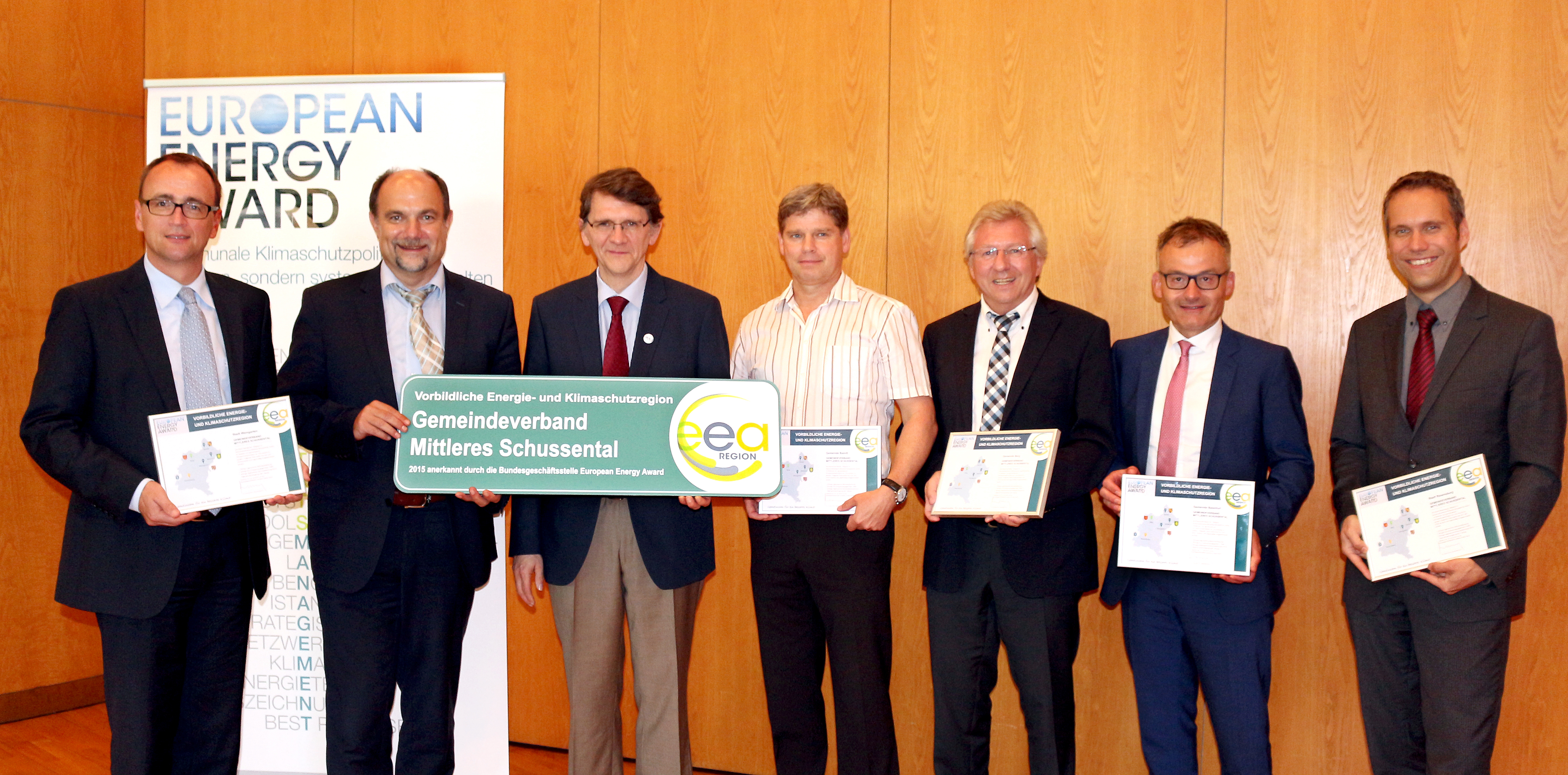 Mit der Verleihung des Labels „vorbildliche eea Region“ an die fünf (Ober-)Bürgermeister des Gemeindeverbands Mittleres Schussental am 15. Juli 2015 im Kultur- und Kongresszentrum Weingarten wurde nun dieser große Erfolg gefeiert. Auf dem Bild sind die Akteure mit ihren Auszeichnungen zu sehen (v.l.n.r.): Oberbürgermeister Markus Ewald (Weingarten), Walter Göppel (Energieagentur Ravensburg), Leonard Meyer (B.& S.U.), Bürgermeister Elmar Buemann (Baindt), Bürgermeister Helmut Grieb (Berg), Bürgermeister Günter A. Binder (Baienfurt) und Bürgermeister Dezernat III Dirk Bastin (Ravensburg). Die Auszeichnung nahm Leonard Meyer von der Bundesgeschäftsstelle European Energy Award in Berlin vor. Das Label wird an Regionen in Deutschland verliehen, in denen Gemeinden und Städte vertieft im Bereich Klimaschutz zusammenarbeiten und ein hohes Engagement im Rahmen des eea, dem internationalen Qualitätsmanagement- und Zertifizierungssystem für kommunalen Klimaschutz. „Sie sind seit Jahren aktiv im Klimaschutz. Sie und Ihre Bürger und Bürgerinnen erhalten dafür dieses Label, diese Anerkennung“, so Meyer."