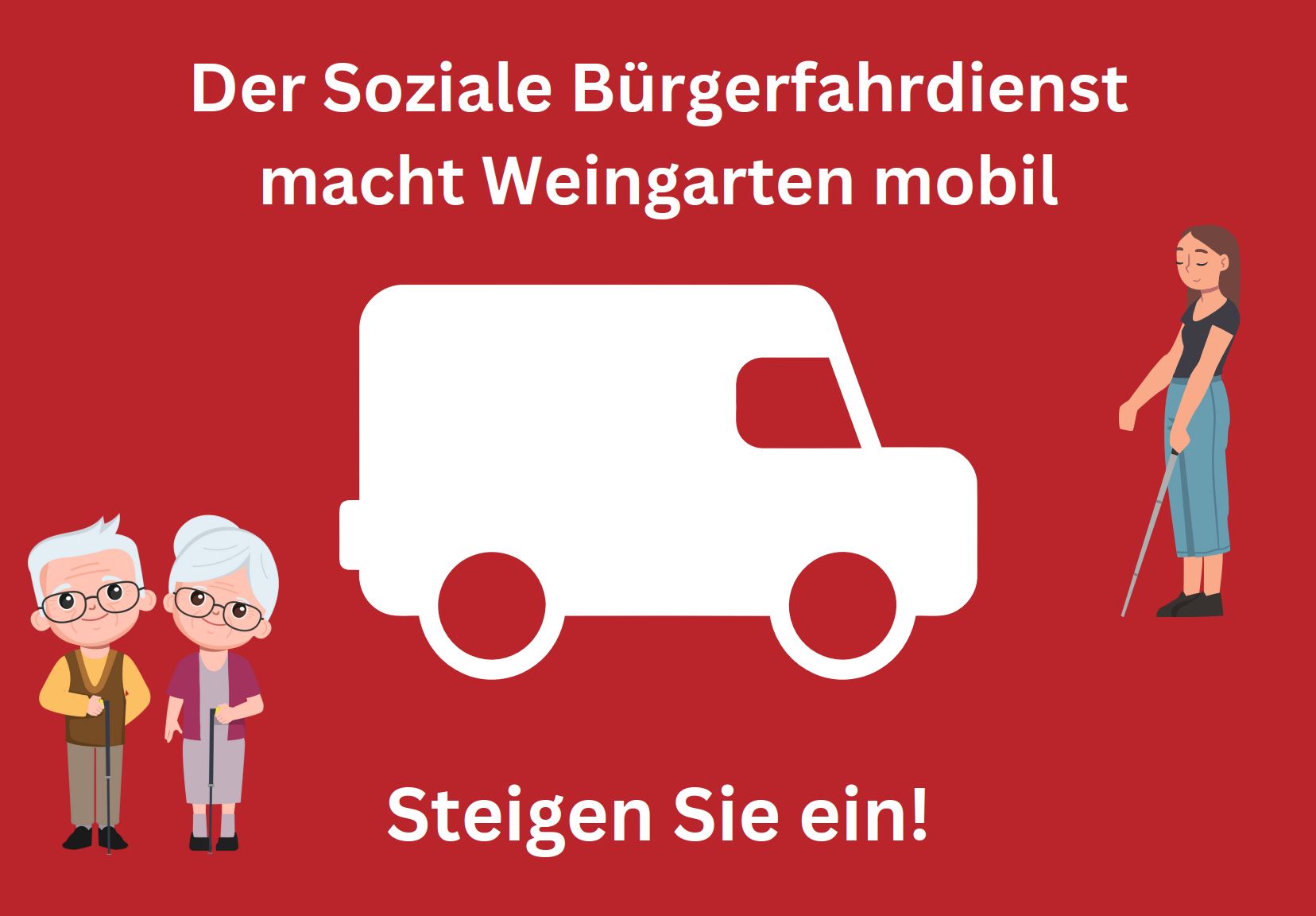 Im März 2024 hat der Stadtseniorenrat zusammen mit der Gruppe "Bürger in Kontakt" das Projekt Sozialer Bürgerfahrdienst gestartet - mit großem Erfolg. Der Fahrdienst dient als Ergänzung zum öffentlichen Personennahverkehr und richtet sich an Menschen, die nicht (mehr) gut zu Fuß sind. Ermöglicht wird das Projekt durch das vorbildliche Engagement vieler: Gewerbetreibende aus Weingarten haben das großräumige Fahrzeug gesponsert, die Fahrdienste übernehmen Ehrenamtliche.