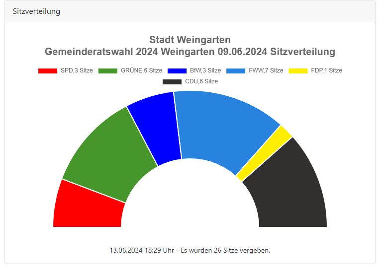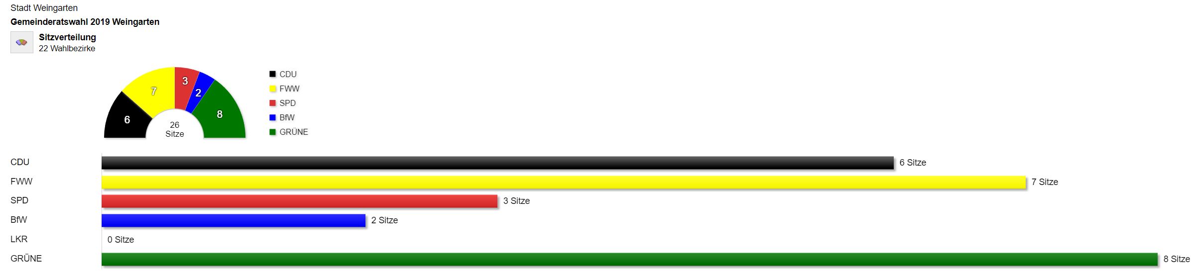 Die städtische Wahlleiterin Fabienne Kolb hat am Montag, 27. Mai 2019, um 14.36 Uhr das vorläufige Ergebnis der Gemeinderatswahl in Weingarten bekanntgegeben. So entfallen 21,31 Prozent der Stimmen auf die CDU (2014: 28,84%), 26,17 Prozent der Stimmen auf die Freien Wähler (2014: 22,99%), 12,89 Prozent auf die SPD (2014: 17,19%), 9,57 Prozent auf Die Bürger für Weingarten (2014: 11,28%), 0,96 Prozent auf die Liberal-Konservativen Reformer sowie 29,11 Prozent auf Bündnis 90 Die Grünen. Das vorläufige Ergebnis wirkt sich wie folgt auf die künftige Sitzverteilung im Rat aus: 8 Plätze entfallen so auf Bündnis 90 / Die Grünen, 7 Plätze entfallen auf die Freien Wähler, die CDU wird laut vorläufigem Ergebnis künftig mit 6 Sitzen im Gemeinderat vertreten sein, die SPD mit 3 Sitzen und die Bürger für Weingarten mit 2 Sitzen. Nach dem vorläufigen Ergebnis beträgt die Wahlbeteiligung in Weingarten bei der Gemeinderatswahl 52,49 Prozent. Dies entspricht einer Steigerung um 11,41 Prozentpunkte zu 2014 (41,80%).Das Endergebnis findet Sie auch in dieser Übersicht.