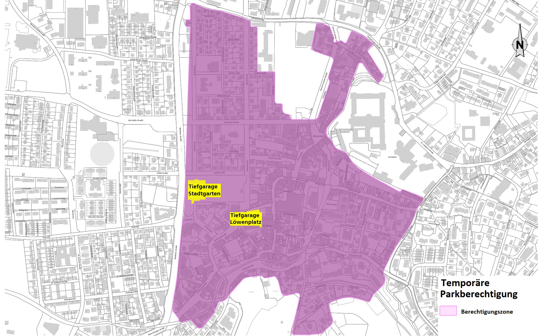 Für Anwohnerinnen und Anwohner, die bislang von der in den Randzeiten und am Wochenende kostenfreien Parkmöglichkeit in den Tiefgaragen am Stadtgarten und am Löwenplatz Gebrauch machen konnten, bietet die Stadt in der Übergangszeit bis zur Einführung eines digitalen Bewohnerparkausweises eine pragmatische Zwischenlösung an: Eine temporäre Parkberechtigung ermöglicht es der Anwohnerschaft in der definierten Zone (vgl. Abbildung) ab Mai, die Tiefgaragen am Stadtgarten und am Löwenplatz zu für sie besonders relevanten Abendzeiten kostengünstig für 15 Euro im Monat zu nutzen – montags bis samstags von 16 bis 8 Uhr sowie an Sonn- und Feiertagen ganztägig. Voraussetzung: Der Hauptwohnsitz befindet sich im definierten Anwohnergebiet, pro Person kann jeweils nur eine Parkberechtigung beantragt werden, die Parkberechtigung gilt jeweils für ein festes, nicht übertragbares Kennzeichen und das Fahrzeug muss auf die antragstellende Person zugelassen sein oder es wird eine Haltererklärung abgegeben. Ausgenommen von diesem Angebot sind Wohnmobile, Campervans, Anhänger und Motorräder. Die Parkberechtigung kann seit dem 15. April 2026 via E-Mail an tiefgarage@stadt-weingarten.de beantragt werden. Die Regelung gilt ab dem 1. Mai 2026. Für die Beantragung wird eine Kopie des Personalausweises, eine Kopie des Fahrzeugscheins sowie die Angabe der Zahlungsweise (SEPA-Lastschrift) benötigt.