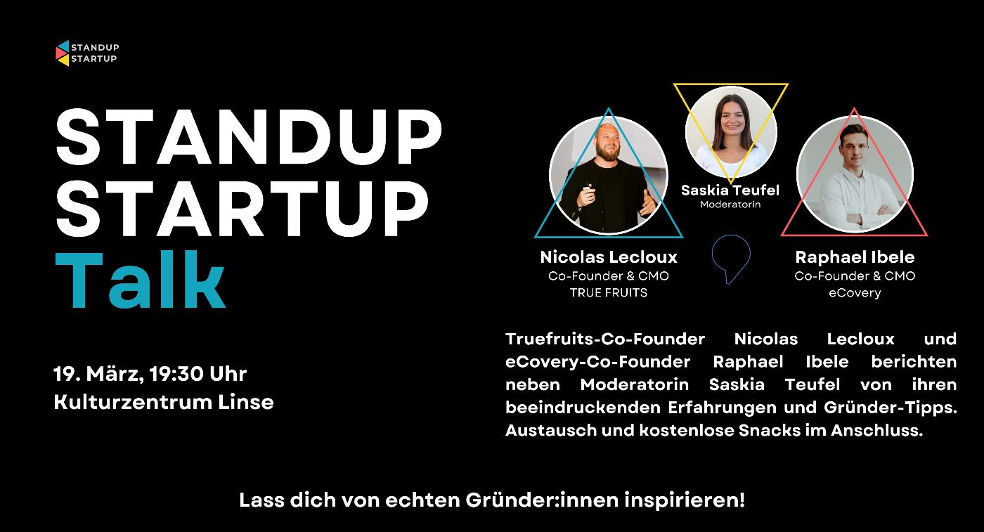 Truefruits-Co-Founder Nicolas Lecloux und eCovery-Co-Founder Raphael Ibele berichten neben Moderatorin Saskia Teufel von ihren beeindruckenden Erfahrungen und Gründer-Tipps. Austausch und kostenlose Snacks im Anschluss.