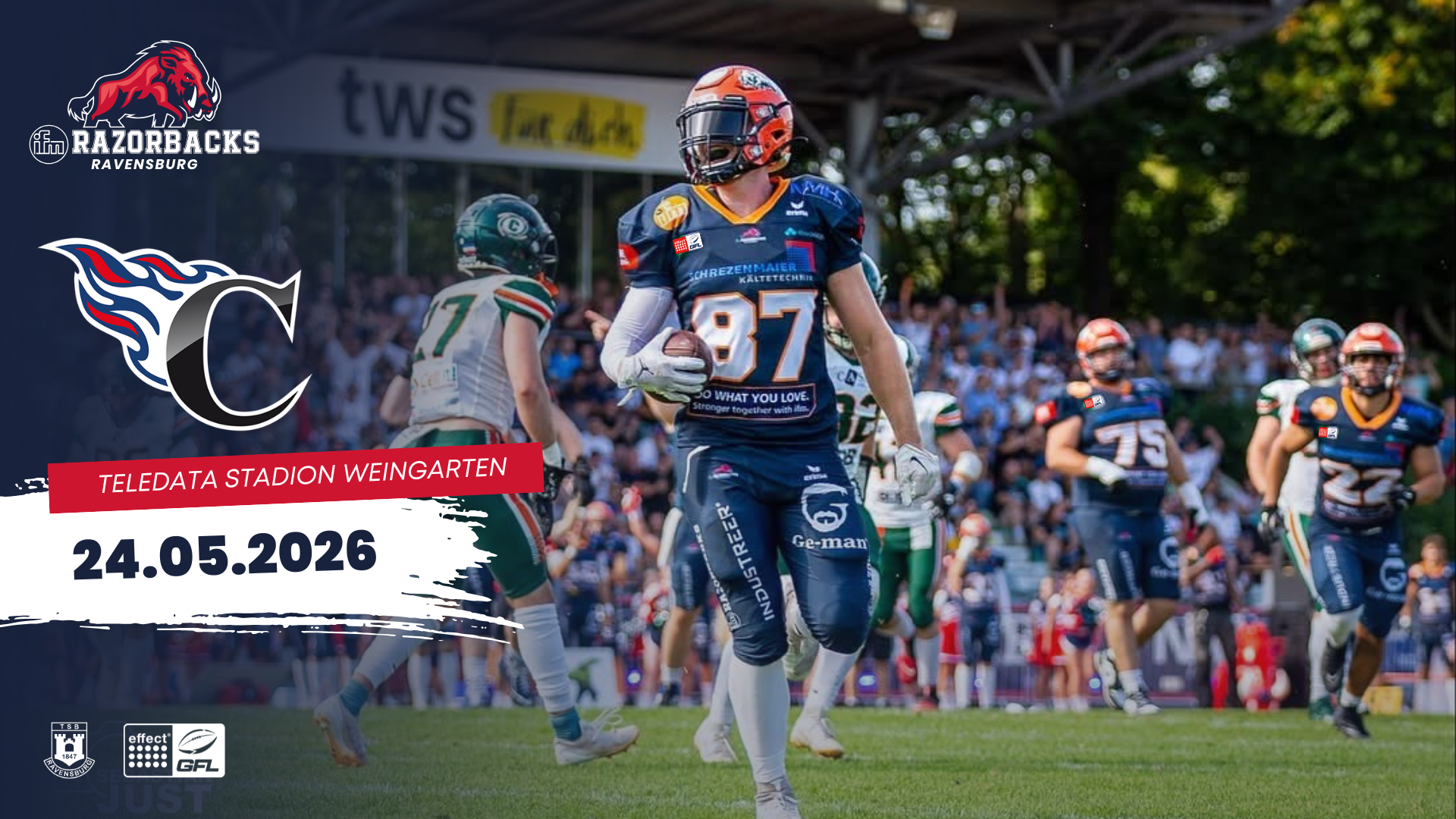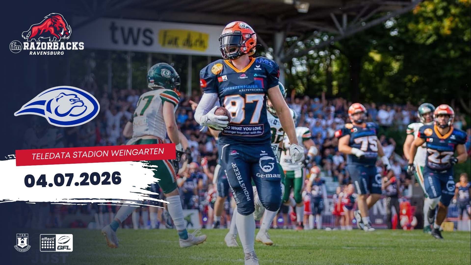 Erlebt packenden American Football in Oberschwaben: Die ifm Razorbacks treffen auf die Pforzheim Wilddogs! Seid live dabei, wenn der Ball zum Kick-off um 18 Uhr fliegt.