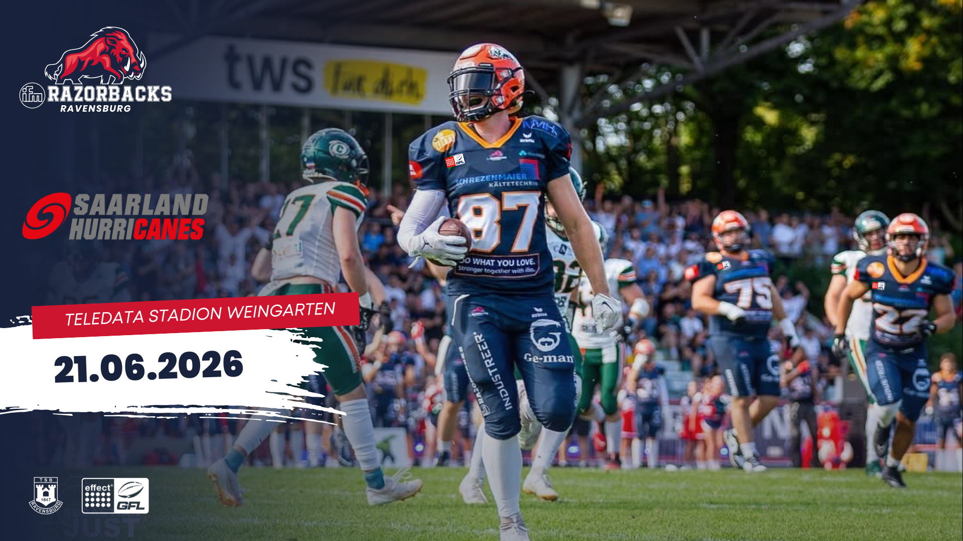 Erlebt packenden American Football in Oberschwaben: Die ifm Razorbacks treffen auf die Saarland Hurricanes! Seid live dabei, wenn der Ball zum Kick-off um 15 Uhr fliegt.