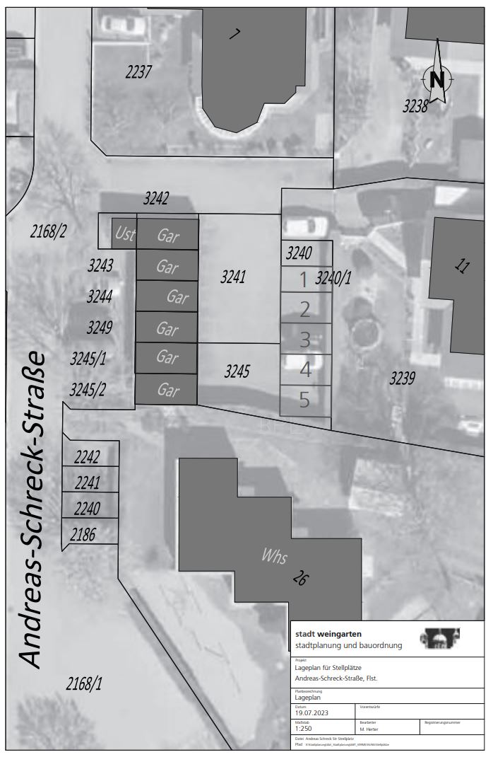 Die Stadt Weingarten vergibt ab dem 1. September 2025 drei Pkw-Stellplätze in der Andreas-Schreck-Straße.